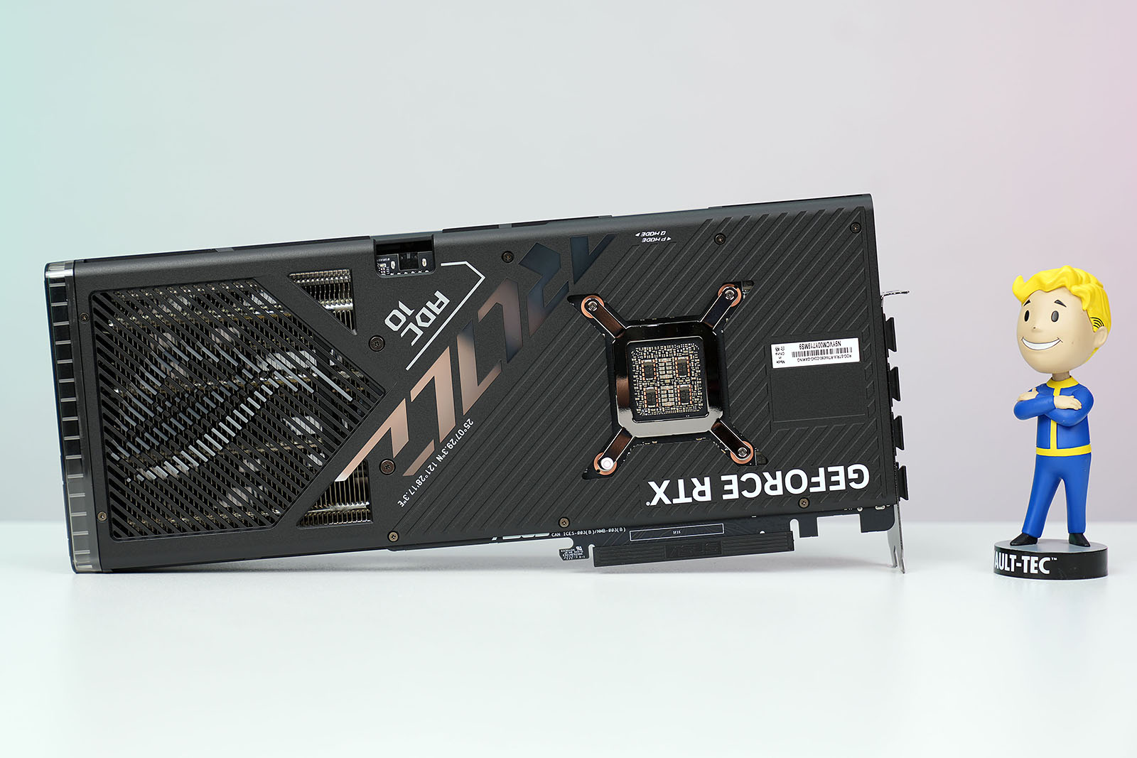 ROG RTX4090 O24G采用了前罩-风扇组-大型一体式散热片-前固定金属框体-PCB-后固定金属板的设计思路。这样做的好处是,一方面整体更为坚固,显卡重量被较好得均摊到各个部分;同时风道被设计得更为合理,多个出风通道能更快带走核心与显存的积热。