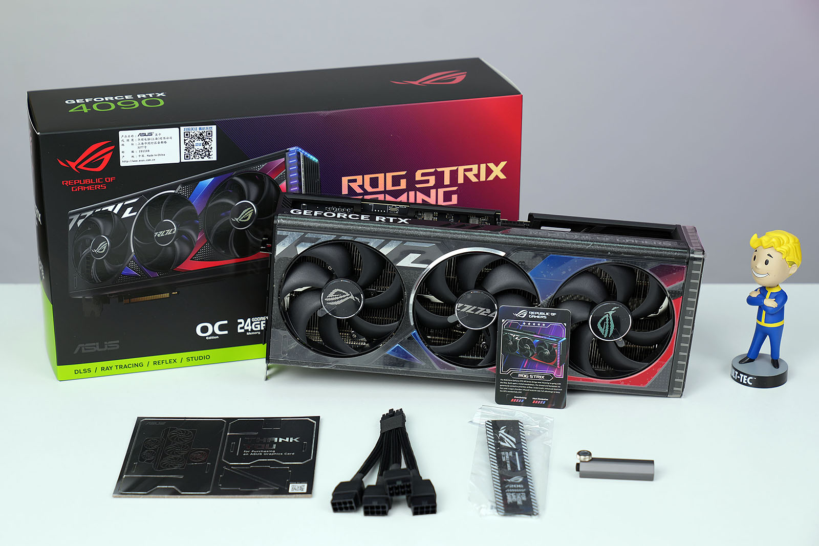 当然,ROG RTX4090 O24G并不是我们体验过最大的RTX4090,四四方方的设计使其相较采用“张牙舞爪”外观方案的产品更为收敛,甚至在一众RTX40中显得有些“低调”。还有,买ROG板卡的同时收集小配件是另一种乐趣,这次华硕特别送出了收集卡,绑带和2in1的显卡支架(旋出延伸段后,翻转再旋入本体,而另一头为装机十字螺丝批头)。