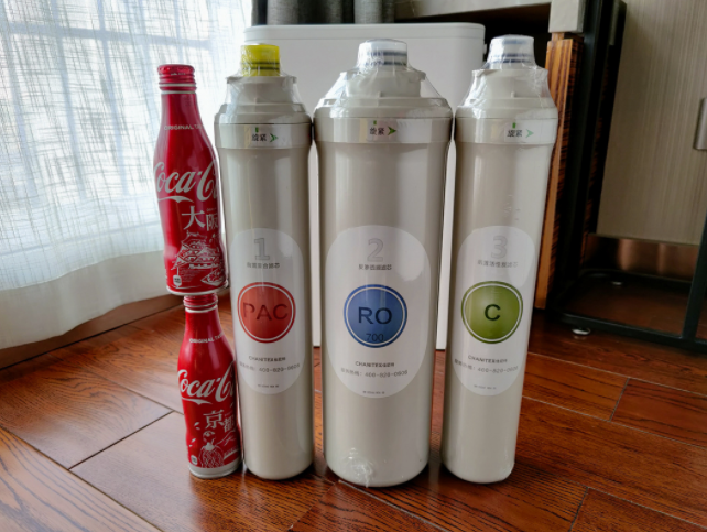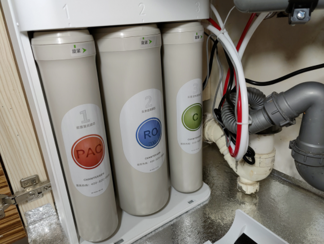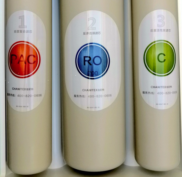 打开面板,在滤芯安装槽上方有1、2、3标识,分别对应1、2、3号滤芯,滤芯上也有明确的编号,保障更换滤芯不会出现装错位置。1号PAC前置复合滤芯,2号RO反渗透膜滤芯,3号后置活性炭滤芯。