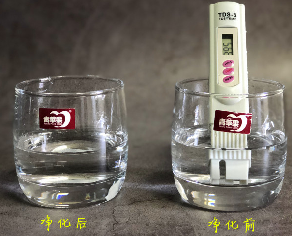 用两个相同的水杯,分别接等量的自来水和净化后的纯净水,用TDS笔分别测试,数值分别为395和9,相差44倍之多,怪不得我家自来水这么难喝。