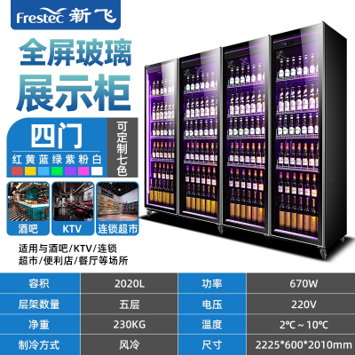 新飞啤酒柜展示柜全屏酒吧冰箱大容量冰柜保鲜柜饮料冰柜_四门工程款真风冷镀膜门免倒水三色切换2225x600x2010