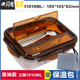 三维工匠3分隔玻璃饭盒大号保鲜盒微波炉大容量便当盒玻璃密封碗带盖 棕色三格840ML【送保温包】